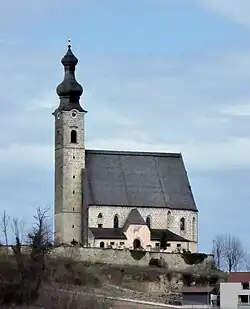 Die aus regelmäßigen Nagelfluhquadern erbaute, 1447 geweihte Kirche mit eingezogenem, dreiseitig geschlossenem Chor steht am Südende des großräumigen Angers des gleichnamigen Ortes und ist demgegenüber nochmals erhöht. Dadurch wie auch durch den 1739 aufgestockten und mit einer doppelten Zwiebelhaube abgeschlossenen Westturm sowie durch das steile Dach hat die Kirche eine Fernwirkung in der Landschaft wie sonst nur Wallfahrtskirchen. Das Dach ist schindelgedeckt.