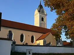 Im nördlichen Winkel erhebt sich ein quadratischer Turm mit geschwungener Haube zwischen halbrunden Giebeln. Es ist ein Saalbau mit eingezogenem, dreiseitig geschlossenem Chor; dieser vermutlich um 1300 erweitert, ab 1668 verlängert und die Sakristei vom Turm verlegt.