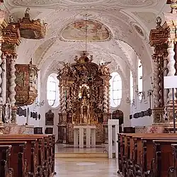 Ab 1717 erfolgte eine größere Umgestaltung des Kirchenbaus aufgrund der Zunahme der Wallfahrt. Dadurch erhielt sie die barocke Form und die barocke Ausstattung, die heute noch zu sehen ist.[3] Es wurde eine Friedhofsmauer errichtet mit anderen Bauteilen, sowie das Portal erneuert und der Kanzelaufgang. Der Hochaltar in seiner heutigen Gestalt wurde i.J. 1732 geschaffen. Der jetzige zwiebelartige Turmabschluss stammt aus dem Jahr 1764 und löste das vorherige alte Satteldach ab. Die Rahmenstuckdecke und die Fresken stammen aus dem Umkreis von Johann Anton Gumpp, der als Hofmaler am kurfürstlichen Hof unter Kurfürst Max Emanuel in München tätig war.