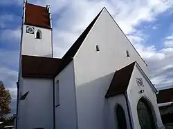 Das Langhaus der aus dem 14./15. Jahrhundert stammenden gotischen Saalkirche wurde 1602 nach Westen verlängert. Der eingezogene, dreiseitig geschlossene Chor im Osten stammt im Kern aus der zweiten Hälfte des 14. Jahrhunderts. Die unteren Geschosse des Chorflankenturms an der Nordwand des Chors sind noch älter. Der Turm wurde später aufgestockt und mit einem quer angeordneten Satteldach zwischen Staffelgiebeln bedeckt. In seinem Glockenstuhl hängen vier Kirchenglocken.[1] An der Nordseite des Langhauses wurde eine Kapelle angebaut. Das Vorzeichen im Westen führt zum Portal.