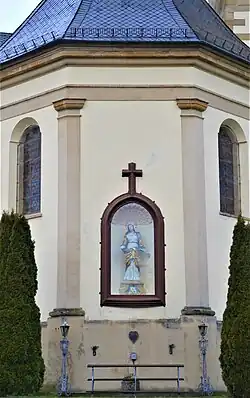 Der kreuzförmige Saalbau, der einen nach drei Seiten schließenden Chor besitzt, ist in drei Abschnitte gegliedert, nämlich Portalachse, Querarm und Chor, der südlich von der Sakristei und nördlich vom Turm flankiert wird. Das Dach war bis 1871 ein Plattendach, das nach einem schweren Sturm durch ein Schieferplattendach ersetzt wurde. Nur die Westfassade, die gegenüberliegende Portale und der Quadersockel sind steinsichtig, die restliche Kirche ist verputzt, wobei die Gliederung graubraun abgesetzt ist. Am Chorscheitel befindet sich anstatt eines Fensters eine große Figurennische, in der in Holz gerahmt eine aus Terracotta gefertigte Marienstatue von Prospero Brenno steht, die in Haltung und Ausdruck für Schwaben ungewöhnlich ist. 1884 wurde bei ihrer Restaurierung der Gesichtsausdruck verändert.