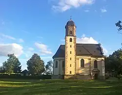 Ritter Ulrich II. von Rechberg ließ 1488 eine neue steinerne Kapelle an der Stelle des ehemaligen Pfarrhauses und heutigen Gasthauses errichten. Dieser Bau, der bis heute parallel zur Holzkapelle steht, besaß ein Rippengewölbe, dessen Schlussstein heute im Südgiebel der neuen Kirche prangt, und das Wappen der Grafen von Rechberg zeigt. Es gibt jedoch eine Beschreibung dieser Kapelle in der Schwäbischen Geschichte von Crusius.