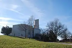 Die Kirche liegt südöstlich des Ortes auf dem Storenberg, einem Hügel am Rande des Thurtales. Die weiss gestrichene Betonkirche ist dank ihrer etwas erhöhten Lage im Thurtal weitherum sichtbar. Der Kirchturm besitzt ein fünfstimmiges Geläute, das in der Tonfolge cis' – e' – gis' – h' – cis' erklingt.[3] Eine Treppe und seit 2016 auch ein Lift führen vom Vorplatz zur Kirche und zum im Untergeschoss eingebauten Pfarreizentrum hinauf. Eine Besonderheit der Kirche ist das Eingangsportal, welches aus verzinktem Eisenblech geschmiedet wurde. Die azurblaue Farbe verweist auf den Himmel und damit auf die Präsenz Gottes. Aus dem Blau des Portals ragt der in Grün gehaltene Türgriff hervor. Die grüne Farbe drückt die Hoffnung der Menschen an Gottes Macht und Güte aus. Das weisse Kreuz am Portal verweist auf die christliche Ausrichtung des Gotteshauses, basierend auf Joh. 3,16.[4]