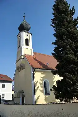 Die Saalkirche wurde in der zweiten Hälfte des 17. Jahrhunderts erbaut und 1958 nach einem Entwurf von Friedrich Haindl erneuert. Sie besteht aus einem Langhaus, das einen dreiseitigen Abschluss im Osten hat. Aus seinem Satteldach über dem Giebel im Westen erhebt sich ein quadratischer Dachreiter, der mit einer Zwiebelhaube bedeckt ist. Sein oberstes Geschoss mit abgeschrägten Ecken beherbergt die Turmuhr und den Glockenstuhl.