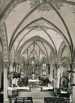 Die ursprünglich üppige neugotische Innenausstattung der Kirche von 1890 ging bei einer Renovierung im Jahre 1970 unter Pfarrer Heinrich Roth größtenteils verloren oder wurde verkauft. Erhalten blieben lediglich einige Heiligenstatuen, die von Mitgliedern des Pfarrgemeinderats bewahrt wurden und das Kruzifix. Die Säule, auf der die Kanzel ruhte befindet sich noch heute in der Kirche – sie wurde zum Ambo umgearbeitet.[3]