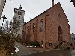 Die Kirche befindet sich in der Lochstraße 1 und steht unter Denkmalschutz. Es handelt sich um einen neugotischen Bau mit eingezogenem polygonalem Chor; 1823 bezeichnet. Daneben befindet sich ein spätgotischer Turm von einer ehemaligen Schlossanlage.[1]