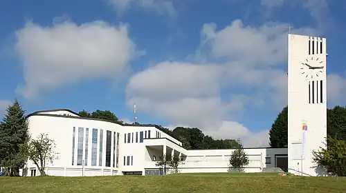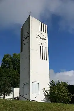 Fritz Metzger gestaltete das Ensemble von Kirche, Pfarreizentrum, Pfarrhaus und Kirchturm in modernem Architekturstil auf einem langgezogenen, dreiecksähnlichen Grundriss. Im nach Art eines Campanile freistehenden, viereckigen Glockenturm mit abgeschrägter Dachfläche ist im Erdgeschoss ein Raum für die Jugendgruppen untergebracht.