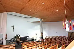 Das Innere der Kirche besteht aus einem querovalen Raum, der sich aus verschiedenen Kreissegmenten zusammensetzt. Über dem Altarraum befindet sich ein schräg gestellter Baldachin, der zur guten Akustik der Kirche beiträgt. Gestützt wird das Dach über dem Altarraum durch eine einzelne Säule auf der rechten Seite und eine Seitenwand, die durch vertikale Schlitze durchbrochen ist. Diese Seitenwand grenzt den Altarraum vom Seitenaltar ab, auf dem sich der Tabernakel befindet. Geschmückt wird der Tabernakel durch weisse Emailleplatten, in deren Fugen sich goldene Dornenzweige zeigen. Der brennende Dornbusch aus dem Alten Testament weist auf die Präsenz Gottes im geweihten Brot hin, das im Tabernakel aufbewahrt wird. Über dem Tabernakel ist ein Kreuz mit Corpus angebracht, welches wiederum mit weissen Emailleplatten belegt ist. Der Hauptaltar stand ursprünglich an der Chorwand an erhöhtem Platz, wurde aber nach der Liturgiereform zum Volksaltar umgenutzt. An seiner Stelle befinden sich die Priestersedien vor der Chorwand. Die Kirchenbänke bieten 350 Personen Platz. Als Besonderheit ist der Boden im Bereich der Kirchenbänke nicht mit den schwarzen Schieferplatten bedeckt, die den übrigen Kirchenboden gestalten, sondern mit Holzklötzchen, die mit langen Latten aus dunklem Holz gruppiert werden. An der Rückfront der Kirche befindet sich über der Taufkapelle und dem Haupteingang der Kirche die Empore. Auf ihr hat der Architekt ein permanentes, halbkreisförmiges Podest für den Chor errichtet. Die Orgel ist auf der Nordseite der Kirche angebracht. Die Werktagskapelle ist sowohl vom Kirchenraum als auch vom Vorplatz zugänglich und besteht aus einem schlichten längsrechteckigen Raum, der mit Glasfenstern geschmückt ist. Der geschwungene Kirchenraum erhält seinen sakralen Gestus durch die farbigen Glasfenster, die der Zürcher Kunstmaler Fritz Weigner geschaffen hat. In Rot-, Gelb- und Blautönen greifen die Fenster in abstrakten Motiven die Bedeutung der Kirchenpatronin als Maria Königin auf.[7]