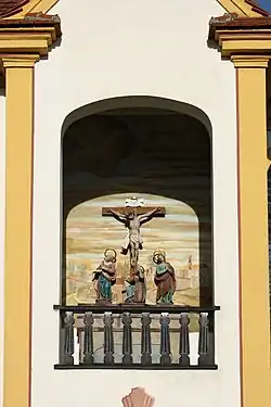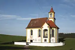 Die Kapelle wurde vermutlich auf den Grundmauern eines Vorgängerbaus errichtet. Der steil proportionierte Bau besitzt einen Turm mit Zeltdach und einen Chor mit dreiseitigem Schluss. An der Südseite befindet sich eine korbbogige Ädikulaform mit Nischenaltar, in die eine Kreuzigungsgruppe eingestellt ist. Der Baukörper wird von einem kräftigen Traufgesims sowie von farblich gefassten Eckpilastern gegliedert.