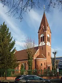 Die Kirche ist ein neugotischer Ziegelbau in Nord-Süd-Ausrichtung.[4] Der quadratische Turm hat einen viereckigen Spitzhelm und ein rundbogiges Eingangsportal mit einer davor liegenden Freitreppe. Auf Höhe des Glockengeschosses liegen große rundbogige Klangarkaden in einer Rundbogenblende. Westlich des Turms ist ein zweigeschossiger, runder Treppenturm angebaut.