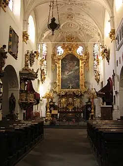 Die Holzschnitzereien des Hauptaltars stellen Fragmente aus dem Leben des Apostels Paul dar. Sie stammen aus der Zeit vor 1740. Jakob Bendl schuf wahrscheinlich um 1650 die Kanzel sowie die Statuen der Ordensheiligen Gerhard und Ubladeska auf den Konsolen des Hauptschiffs.[4] Eine spätgotische hölzerne Madonnenstatue befindet sich im Giebel des Kirchengebäudes.
