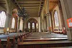 ↑Zum Vergleich:Marienkirche Usedom: hölzerne Arkaden nach Absacken der gemauerten Gewölbe Das Hallenschiff der Marienkirche in Usedom (Stadt) hat eine völlig hölzerne Einteilung, weil die ursprünglichen gemauerten Gewölbe ab Ende des 17. Jahrhunderts instabil wurden.