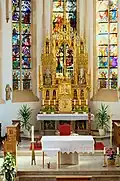 - Der neugotische Hochaltar (Ende 19. Jahrhundert), mit marianischen Szenen, kommt angeblich aus Bonn-Endenich. Dahinter die Chorfensterverglasung mit ebenfalls marianischen Themen stammt aus dem späten 19. Jahrhundert[7] und wurde 1949 renoviert.