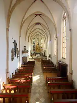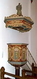 - Die Kanzel aus der ersten Hälfte des 17. Jahrhunderts befindet sich an der fensterlosen Nordwand. Auf dem Schalldeckel befindet sich eine Figur, die einen Zisterzienser (möglicherweise den Heiligen Bernhard von Clairvaux) darstellt.[5]