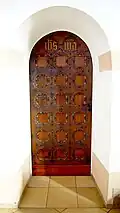 - Die gotische, aus Eichenholz gefertigte Sakristeitür ist mit rechteckigen Kassetten (mit runder Umschnitzung) verziert. Sie stammt vermutlich aus der Zeit um 1500. Die 1,98 Meter und 83 cm breite Tür ist oben mit den nebeneinander stehenden Monogrammen „ihs“ (Jesus) und „ma“ (Maria) verziert.[4]