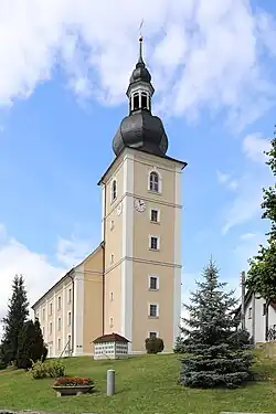Die stattliche Chorturmkirche steht auf einer kleinen Anhöhe. Ihr Äußeres prägen ein hohes Langhaus mit rotem Satteldach und ein sechsgeschossiger Turm mit achteckiger, verschieferter Zwiebelhaube, darüber eine Laterne sowie eine kleine Zwiebelkuppel und eine Helmspitze. Die Fassaden sind durch kräftig profilierte Gesimse und vorstehende Wandpilaster aus farbigem Sandstein gegliedert. Die fünfachsigen Längsfassaden haben in jeder Achse in jedem der drei Geschosse ein rechteckiges Fenster, wodurch das Innere bei Sonnenschein lichtdurchflutet ist. Der rechteckige Innenraum ist nüchtern und streng gestaltet. Er hat eine stuckierte Flachdecke und eine umlaufende, zweigeschossige Empore. Über dem Altar tritt in der unteren Empore die Kanzel hervor. Darüber ist in der oberen Empore die Orgel angeordnet. Hinter dem Altar befinden sich ein abgetrennter Gemeinderaum, der als Winterkirche genutzt wird, und die Sakristei unter dem Kirchturm, die ein spätgotisches, rippenloses Kreuzgewölbe hat. Unter der Kirche befindet sich eine Gruft, in der die Herren von Heßberg bestattet sind.