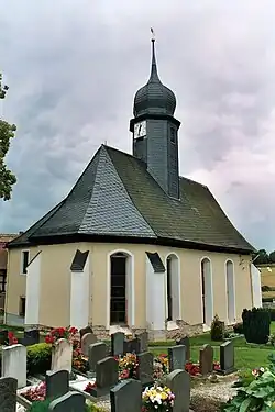 Die im Kern gotische Saalkirche mit polygonalem Abschluss im Osten ist mehrfach, vor allem im 17. und 18. Jahrhundert umgebaut worden. 1989/90 wurde sie letztmals renoviert. An allen Ecken des Kirchenschiffs befinden sich Strebepfeiler. Im Süden liegt ein zweigeschossiger Anbau mit Sakristei und Patronatsloge. Der Dachreiter und seine geschweifte Haube sind schiefergedeckt, ebenso das Satteldach über dem Kirchenschiff.