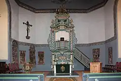 Der Innenraum hat eine dreigeschossige Empore und wird von einer Flachdecke überspannt, die mit einem Gemälde, die Verklärung Christi darstellend, geschmückt ist.