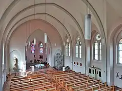 Im ursprünglichen Zustand war die Kirche reich ausgemalt. Diese Ausmalung ging ebenso wie die originalen Ausstattungsstücke wie Hochaltar, Kirchenbänke und Kommunionbank spätestens durch die Umgestaltung der Kirche nach dem II. Vatikanischen Konzil verloren. Auch die Bodenfliesen sowie die Altarinsel stammen aus dieser Zeit.[2]