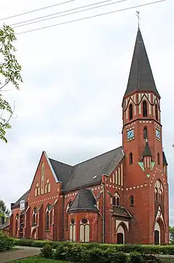 Der neugotische Kirchenbau orientiert sich äußerlich an Vorbildern der norddeutschen Backsteingotik mit weißen Akzenten. Der vorgelagerte Kirchturm verjüngt sich im oberen Stockwerk auf einen achteckigen Grundriss. Die Außenwand des dritten und vierten Joches tritt aus dem Kirchenschiff hervor und erzeugt mit dem Quergiebel den Eindruck eines Querhauses, welches tatsächlich nicht vorhanden ist. Im Innenraum eröffnet sich ein einschiffiger Kirchenraum mit Spitztonnendecke, an den sich ein schmaler Chorraum und eine Apsis mit 5⁄8-Schluss anschließt.[1]
