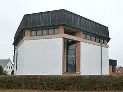 Den modernen, auf einem oktogonalen Grundriss stehenden hell verputzten Kirchenbau zeichnet eine klare sachliche Formensprache aus. Unter dem kupferverblendeten Flachdach verläuft ein Kranz von Buntglasfenstern. Im Innenraum kontrastiert die weiße Brüstung der Nord- und Westempore mit dem roten Farbton der ziegelverblendeten Wände.