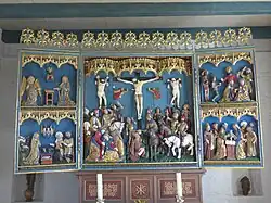 Der gotische Flügelaltar stammt aus der Zeit um 1480. Der Mittelschrein enthält eine geschnitzte Kreuzigungsszene. In den Seitenflügeln stellen Reliefs links Verkündigung und Geburt Jesu, rechts seine Anbetung und Beschneidung dar. 1680 wurde unter jede Szene ein passendes Bibelzitat geschrieben. Am Karfreitag, wenn der Altar geschlossen ist, sind für die Gemeinde Johannes der Täufer und die Figur des Erlösers auf den um 1604 von Govert von Achten gemalten, später überarbeiteten Außenseiten sichtbar. Die mehrfach umgestaltete Predella trägt seit 1959 auf das Abendmahl hinweisende Bibeltexte.[1]