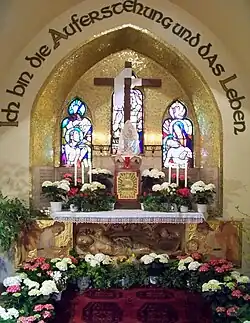 Weitere Bilder und Statuen zeigen die Heiligen Katharina von Alexandrien, Barbara von Nikomedien, Franz von Assisi, den Erzengel Michael, eine Darstellung der Maria Immaculata und eine Kreuzigungsgruppe. Das Christuskreuz in dem den Chorraum abschließenden Bogen fertigte der bayerische Künstler Wilhelm Vierling. Die Innenausstattung stammt von Leo Götz.