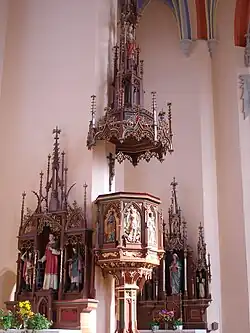 Rechts neben dem Altarraum befindet sich eine Taufkapelle mit Taufbecken und Altar, links die Sakristei. Die Kanzel erhebt sich vor einem Säulenvorsprung an der linken Bankseite, zugänglich über einen Treppenaufgang in der Nähe der Sakristeitür. Die Chorfenster zeigen Darstellungen der Apostel Petrus und Paulus sowie der Bistumspatrone, des Kaiserpaars Heinrich und Kunigunde.