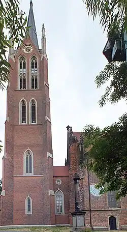Der 86 Meter hohe Turm ist stadtbildprägend. Er steht leicht vom Kirchenschiff entfernt und ist an dieses über einen Verbindungsbau von etwa halber Kirchenhöhe angeschlossen. Der Abstand wurde notwendig, da für seine Gründung 137 sieben Meter lange Eichenpfähle in den Boden gerammt wurden und dabei das Kirchenschiff nicht beschädigt werden sollte.[6] Durch Spitzbogenfenster werden am Turm vier Etagen angedeutet. An den Ecken sitzen diagonal Strebepfeiler an, die sich nach oben verjüngen und in kleinen Sandsteintürmchen auslaufen. Die Giebel dazwischen tragen Ziffernblätter der Kirchenuhr.