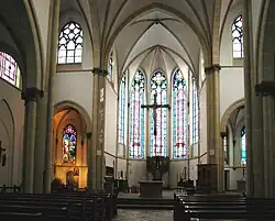 Der Innenraum mit seinen Kreuzrippengewölben, Obergaden, Spitzbögen, Maßwerkfenstern, Säulen und Diensten bezieht seine Wirkung besonders aus dem Kontrast der dunklen Gliederungselemente zu den hell gefassten Flächen.