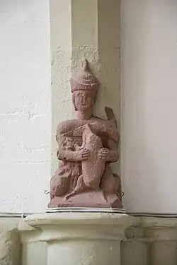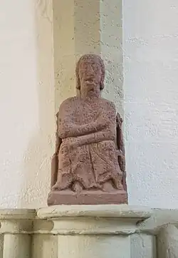 An den Pfeilern an der Westwand links und rechts des freigelegten Eingangstores sind zwei Relief-Figuren aus der Bauzeit um 1310. Die linke Figur am südlichen Pfeiler trägt einen spitzen Hut, eine Darstellung, die auch an anderer Stelle zur Kennzeichnung von Juden verwendet wurde. Im Arm hat die Figur ein nicht mehr vollständig erhaltenes Schwein, es handelt sich um die Darstellung einer Judensau, ein typisches Motiv des mittelalterlichen Antijudaismus. Der nördliche Pfeiler soll eine Christusfigur zeigen, zusammen bilden die beiden Figuren eine Abwandlung der Ecclesia und Synagoge.[5]