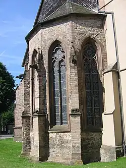 Es wurde ein neuer Chorabschluss im Stil der Frühgotik errichtet, in der seltenen Form von fünf Seiten eines Zehnecks. Vermutlich wurde die Ostseite parallel zur Westseite errichtet, da – vermutlich aufgrund eines Messfehlers – die Achse nach Norden hin leicht verbogen ist. Dies machte sich bei den zu errichtenden Langhausjochen besonders bemerkbar.
