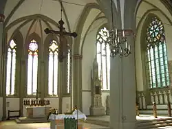 Die fünf Chorfenster sind in ein dichtes System von Rund-Diensten eingespannt. Je drei dieser gebündelten Dienste stehen in den Ecken, der mittlere nimmt die Rippe auf, die beiden seitlichen die Schildgurte über den Fenstern. Das fünfkappige Rippengewölbe hat seinen Schlussstein genau im Scheitel des Chorbogens.