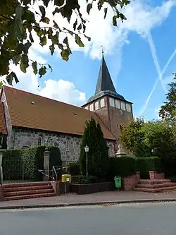 Von der Saalkirche wurden im 13. Jahrhundert auf einer Wurt zuerst das Langhaus und der quadratische, eingezogene Chor aus Feldsteinen und Tuff gebaut. Um 1500 wurde das Langhaus nach Westen verlängert und der wuchtige Kirchturm aus Backsteinen errichtet. Auf jeder Längsseite des Kirchenschiffs sind drei spitzbogige Fenster, die Laibungen sind aus Tuffstein. In der Stirnwand des Chores ist ein spitzbogiges Fenster, das von Bogenfenstern flankiert wird. Das Erdgeschoss des Turmes war ursprünglich gewölbt, heute ist es mit einer Flachdecke überspannt. Die obere, über das Satteldach des Langhauses hinausreichende Wandzone des Turms wird durch weiß verputzte, korbbogige Blenden gegliedert. Die Kirchenglocke wurde 1520 gegossen. Der achtseitige barocke Helm wurde erst 1750 aufgesetzt.