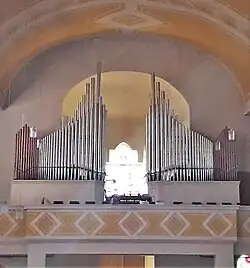 Die Orgel der Kirche wurde 1956 von der Firma Hugo Mayer Orgelbau erbaut. Das auf einer Empore aufgestellte Kegelladen-Instrument verfügt über 24 (26) Register, verteilt auf zwei Manuale und Pedal. Die Spiel- und Registertraktur ist elektropneumatisch. Die Disposition lautet wie folgt:[8]