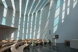 Der helle Innenraum ist vom Kontrast der weißen geschwungenen Wände zum dunklen Steinfußboden mit Spuren fossiler Meerestiere geprägt. Die sandfarbenen Bänke sind im Halbkreis auf den Altar hingeordnet. Die dreieckig an den Hauptraum angefügte Marienkapelle, in deren Spitze das Marienbild steht, lädt zur Einzelandacht ein.