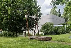 Im Jahr 1999 wurde im Außenbereich des Kirchengeländes die lebensgroße Plastik Christus aller Opfer – Menschen der Versöhnung von Maksymilian Biskupski aufgestellt. Sie zeigt den gebrochenen Körper Jesu, der nackt an einem Kreuz hängt, das aus zwei Andreaskreuzen besteht, die einen Querbalken mit der Aufschrift Ecce homo (dt.: Seht, der Mensch) tragen. Die beiden Andreaskreuze bestehen aus zwei gekreuzten Schienen, die einst zum Konzentrationslager Auschwitz führten. Das Monument Biskupskis ist als Mahnmal zu verstehen: Wie Jesus am Kreuz wurden Millionen von Menschen unter den Nationalsozialisten in Konzentrationslagern gedemütigt und entmenschlicht. Umso erstaunlicher und erfreulicher ist die Versöhnung, welche sich nach Kriegsende zwischen Völkern und Religionen entwickeln konnte.[6][14]