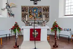 Der Altarbesatz, in seinen ältesten Teilen noch gotisch erhalten, zeigt die Anbetung des Jesuskindes durch die drei Weisen aus dem Morgenland. Die Inschrift nennt Dorothea von Minnigerode als Stifterin dieses Aufsatzes von 1614.