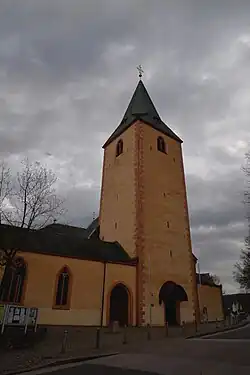 Die heutige Kirche wurde, unter Verwendung älterer Bauteile der Burgkapelle oder etwa des Turms der Stadtbefestigung, zwischen 1335 und 1440 errichtet. Der Kirchenpatron St. Martin erscheint auch im Wappen der Stadt.