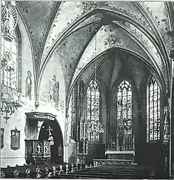 Die Wände sind durch dreibahnige Fenster mit Fischblasenmaßwerk gegliedert. Ein umlaufendes Sohlbankgesims fasst das Gebäude zusammen, eine weitere Gliederung wird durch die Strebepfeiler erreicht. Der Eingang im Turm ist nachträglich eingebaut, die Schallarkaden mit eingestellten Säulen sind rundbogig. Im Innenraum ruht das Kreuzrippengewölbe auf Konsolen. Die bauzeitliche Ausmalung wurde 1957 und 1958 nach Befund restauriert. Die Turmhalle ist ebenfalls mit einem Kreuzgratgewölbe ausgestattet, sie öffnet sich mit einem Spitzbogen zum Kirchenschiff.