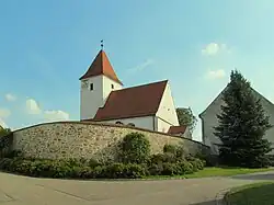 Die Saalkirche wurde im 15. Jahrhundert erbaut und im 18. Jahrhundert umgebaut. Sie besteht aus einem Langhaus, das mit einem Satteldach bedeckt ist, und einem Chorturm auf quadratischem Grundriss im Osten, der mit einem Pyramidendach bedeckt ist. Zur Kirchenausstattung gehören der 1799/1800 von Christoph Luybl gebaute Hochaltar und die ihm zugeschriebene Kanzel.