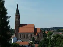Die heutige Pfarrkirche wurde ab 1477 von den Meistern der Landshuter Bauhütte erbaut, die um dieselbe Zeit auch die Martinskirche in Landshut errichteten. Ein Porträt des heute unbekannten Erbauers ist in der Vorhalle des Hauptportals zu sehen. Die Turmobergeschosse wurden erst nach 1547 fertiggestellt. 1688 erfolgten die Barockisierung der Kirche und der Anbau der sogenannten Altöttinger Kapelle. Im Zuge von Arbeiten in den Jahren 1852 und 1870 wurde das Gotteshaus regotisiert. 1965 wurde bei den Ausschachtungsarbeiten für die Kirchenheizung der Grundriss eines kleineren romanischen Vorgängerbaus aus Tuffstein entdeckt. Die letzte große Innenrenovierung fand im Sommer 1993 statt.[2]
