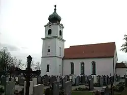 Die Saalkirche wurde, nachdem der Vorgängerbau abgebrannt war, 1688 gebaut und 1721 nach einem Entwurf von Gabriel de Gabrieli umgebaut. Sie besteht aus einem mit einem Satteldach bedeckten Langhaus und einem eingezogenen Chor im Osten, an dessen Südseite 1732/33 der Chorflankenturm angebaut wurde. Die zwei unteren Geschosse haben an den Ecken Lisenen. Das eingezogene oberste Geschoss, das die Turmuhr und den Glockenstuhl beherbergt, hat abgeschrägte Ecken. Der Innenraum des Chors ist mit einem Kreuzgratgewölbe überspannt, der des Langhauses mit einer Flachdecke, die mit Stuck und Deckenmalereien versehen wurde. Der 1782 gebaute Hochaltar wurde nach einem Entwurf von Maurizio Pedetti gebaut. Die Seitenaltäre stammen aus der Stiftskirche. Die Kanzel wurde erst 1870 errichtet. Die Kreuzigungsgruppe wurde bereits um 1500 geschaffen. Ein Gemälde ist von Johann Baptist Zimmermann. Die Orgel mit 4 Registern wurde 1959 von E. F. Walcker & Cie. gebaut.[1]