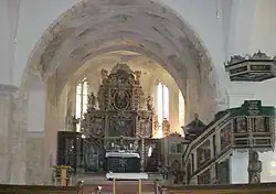 Der Chor wird von einem Kreuzrippengewölbe überspannt. Im Chor finden sich auch Reste von Wandmalereien. Bemerkenswert ist der 1693 entstandene große mehrgeschossige Altar, der die Höhe des Chors einnimmt und über seitliche Durchgänge und Priechen verfügt. Bildnisse stellen das Abendmahl, die Kreuzigung und die Auferstehung dar. Die Rahmen sind als Knorpelwerk gestaltet.