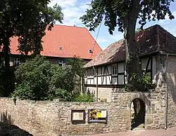 Nordöstlich der Kirche, auf der gegenüber liegenden Straßenseite, befindet sich der Pfarrhof (Kirchstraße 16). Das Pfarrhaus stammt aus dem Jahr 1611, ist zweigeschossig aus Bruchstein erbaut und wird von einem großen Walmdach bedeckt. Zum von einer Mauer umfassten sehr großen Pfarrhof gehört auch ein polygonaler Taubenturm sowie eine Scheune. Das obere Geschoss der Scheune ist in Fachwerk errichtet und ruht auf einem Bruchsteinsockel.