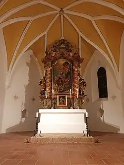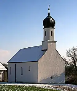 Der Chor ist gotisch und wird gedeckt von einem auf Kragsteinen aufsitzenden Netzgewölbe. Zwei der Kragsteine tragen Schilde. Das Langhaus überspannte ein Tonnengewölbe mit Stichkappen. Nachdem es eingestürzt war, wurde es 1971 durch eine hölzerne Kassettendecke ersetzt. An der Nord- und an der Südseite befinden sich noch zwei kleine romanische Rundbogenfenster. An der Westseite ist ein Dachreiter mit Zwiebelhaube aufgesetzt. Zur Ausstattung gehört ein einfacher Barockaltar, der 1657 von dem Wasserburger Bildhauer David Zier geschaffen wurde.