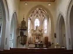 - Die Farbverglasung der Maßwerkfenster im Chor wurde von Bürgern gestiftet und 1960 von Wolf-Dieter Kohler geschaffen:[1]