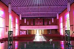 Das Innere der Kirche ist seit der Neugestaltung in den Jahren 1994–1995 in rötliches Licht getaucht, das von den Buntglasfenstern im Kirchenschiff erzeugt wird. Milchglas, das den Buntglasfenstern vorgesetzt wurde, dämpft die Farbgebung ab. Die Konstruktion des Altarbereichs und der daran angebauten Werktagskapelle lässt den Eindruck eines eingezogenen Chores entstehen. Tatsächlich ist dem Altarbereich eine Art Lettner vorgebaut, hinter dem der breitrechteckige Altarbereich die volle Höhe des Kirchbaus ausnutzt. Die Konzeption der Kirche von 1950 ging vom Massverhältnis 1 : 2 aus, auf das man an der ursprünglichen Kirche immer wieder stösst, am deutlichsten im Innenraum, dessen Länge doppelt so gross ist wie die Breite. Auch die Fenster der Saalkirche weisen ähnliche Proportionen auf, haben die sechs Fenster doch eine Höhe von 6 Metern und eine Breite von annähernd 3 Metern.[7] Die Werktagskapelle ist deutlich niedriger als der ursprüngliche Kirchbau. Abgeschlossen wird die Kapelle und damit das ganze Kirchgebäude durch eine Frontwand, in die ein Buntglasfenster in Kreuzform eingelassen ist. Das Mobiliar im Altarraum wurde nach einem künstlerischen Konzept von Carlos Matter (Farbgebung der sechs Fenster im Kirchenraum, Gestaltung des Altarraums) und Sr. Raphaela Bürgi (Glasfenster im Altarraum und Seitenfenster der Werktagskapelle) gestaltet. Das Seitenfenster der Kapelle folgt den beiden Sätzen aus dem Psalmen: «Muss ich auch wandern in finsterer Schlucht, ich fürchte kein Unheil, denn du bist bei mir.» (Psalm 23) "Er beschirmt dich mit seinen Flügeln, unter seinen Schwingen findest zu Zuflucht." (Psalm 91.)[8] Altar, Ambo, Tabernakel, das Chorgestühl sowie der Sockel des Taufsteins bilden durch die orientalisierenden Muster eine Einheit. Die neuen Elemente ergänzen die übernommenen älteren Elemente wie den Taufstein oder das Altarkreuz und den Osterkerzenleuchter von Alfred Huber, Rümlang. Die anderen liturgischen Elemente von Alfred Huber, welche die Kirche zwischen 1974 und 1994 geprägt hatten (Altar, Ambo), wurden dagegen durch neues liturgisches Mobiliar ersetzt. Der Künstler Carlos Matter schreibt zur Gestaltung des Altarraums 1995: Hier «sind Aspekte des Lebens und Wirkens von Sankt Martin in verschlüsselter Weise thematisiert… Die Basis ist bei allen Elementen aus Beton, die Abdeckungen oder Aufsätze sind aus Serpentin. In Übertragung auf St. Martin steht der Beton für das Leben als Krieger und der Naturstein verweist auf das Leben als Mann des Geistes. Der Tabernakel ist ganz aus Stahl – die Rüstung des Ritters. Im oberen Teil ist das ewige Licht integriert, der Kopf als Sitz des Geistes.»[9] Am Ambo können Tücher in den liturgischen Farben eingehängt werden, welche auf den Mantel des hl. Martin von Tours verweisen. Im Eingangsbereich sind Glasfenster, welche 1974 in die sechs Fenster der Kirche eingebaut worden waren, sowie ein Fresko von Mario Comensoli erhalten geblieben.[10] Dieses Fresko stellt den hl. Georg im Kampf gegen den Drachen dar.[11]