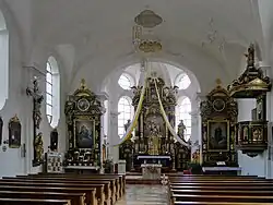 Die Kirchenausstattung stammt von Joseph Elsner junior. Die Entwürfe zu den Skulpturen von Josef Auer stammen von Joseph Elsner senior.