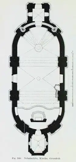 Die auf einer Anhöhe im östlichen Teil des Dorfes gelegene Saalkirche über einem gestreckten ovalen Grundriss ist mit einem Westturm und einer Sakristei im Osten ausgestattet. Unter dem Patronat der Äbtissin des Klosters Marienstern in Panschwitz-Kuckau Cordula Sommer (deren Wappen mehrfach am Bau und am Altar zu finden ist) wurde die Kirche in den Jahren 1740–1743 erbaut. Im Jahr 1830 wurde die einst sehr hohe Turmbekrönung durch die heutige steinerne Laterne ersetzt. Restaurierungen wurden 1907, 1970–1975 im Inneren und 1985–1992 an den Fassaden vorgenommen.